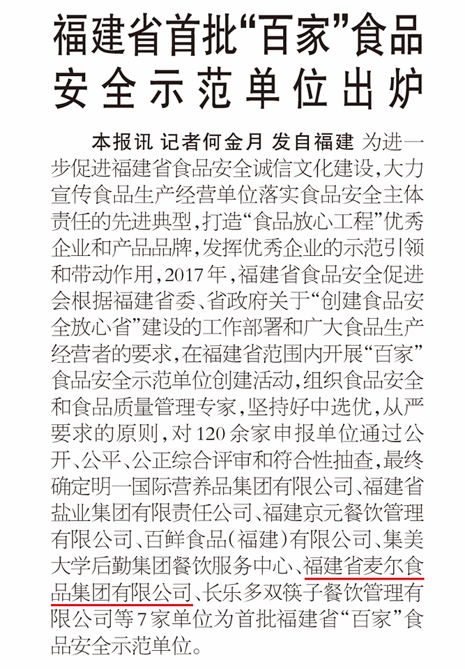 2017年,福建省食品安全促進(jìn)會(huì)根據(jù)福建省委、省政府關(guān)于“創(chuàng)建食品安全放心省”建設(shè)的工作部署和廣大食品生產(chǎn)經(jīng)營(yíng)者的要求,在福建省范圍內(nèi)開(kāi)展“百家”食品安全示范單位創(chuàng)建活動(dòng)。福建省麥爾食品集團(tuán)有限公司榮獲“首批福建省“百家”食品安全示范單位”。